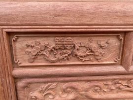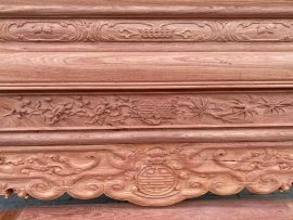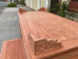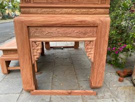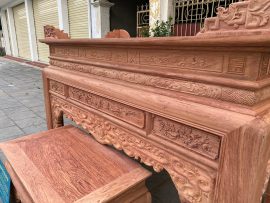 Chị Huyền đặt kèm với án gian thờ một bàn cơm cùng chất liệu mặt liền tấm dày 2cm đóng khuôn tranh dày dặn.Chất liệu gỗ hương đá chế tác bộ án gian sở hữu những tom gỗ đẹp, chất gỗ cứng đanh, vân gỗ độc lạ là điều kiện cần để giúp người thợ sử dụng đôi tay tài hoa của mình để đưa đẩy mũi đục tạo lên những hoa văn độc đáo cho bộ sập.Sản phẩm sau khi hoàn thiện mộc kỹ, xử lý bề mặt nhẵn mịn, sẽ được tiến hành sơn phủ PU cao cấp nhiều lớp để bảo vệ cốt gỗ, gia tăng vẻ đẹp, cho ra diện mạo hoàn hảo nhất tô điểm sự sang trọng, đẳng cấp của không gian.