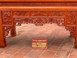 Kích thước: Dài 1m97 x rộng 97 x cao 1m27. Chân vuông 14cm. Ván mặt dày 2cm, khuôn tranh dày 5cm, cổ dày 3cm, dạ (yếm) dày 5cm (Khách hàng có thể tuỳ chỉnh kích thước phù hợp với phong thủy và mĩ quan không gian thờ cúng nhà mình). vai dày 7cm, vách đục dày 3,8cm