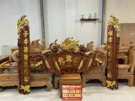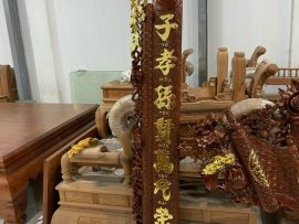 Bộ cuốn thư câu đối chạm khắc tinh xảo phượng hóa bắt mắt. Bên ngoài cuốn thư dát vàng 24k siêu đỉnh cao. Thiết kế hình dáng cuốn thư câu đối thích hợp dùng cho phòng thờ thể hiện sự uy nghiêm, trang trọng và thành kính cho không gian thờ tự.