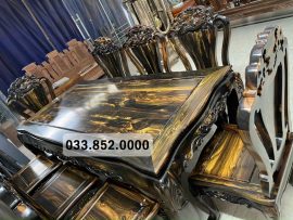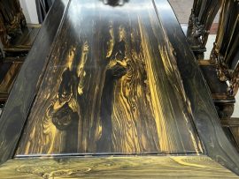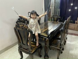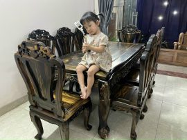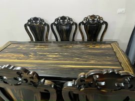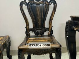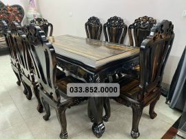 Một bộ gồm 8 ghế và 1 bàn được làm từ gỗ mun hoa. Gỗ mun hoa là một loại gỗ cao cấp, quý hiếm và sang trọng trong các thiết kế nội thất nhà cửa. Đây là loại gỗ được ưu chuộng rộng rãi không chỉ ở Việt Nam mà trên toàn thế giới.