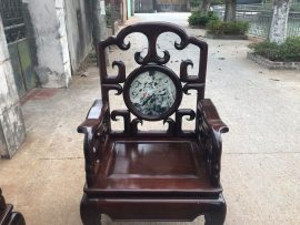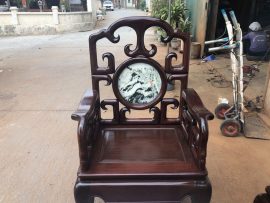 - Ghế đơn móc mỏ kiểu dáng thanh thoát, ván liền gỗ hương đá, tựa đá cẩm tròn tranh sơn thủy lối cổ.