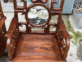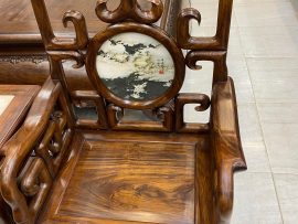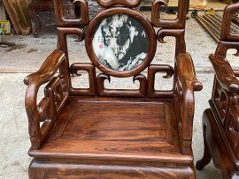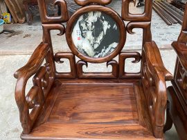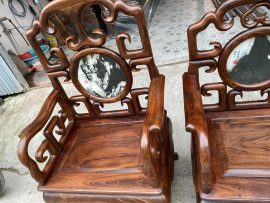 Chương ghế là những tấm gỗ tròn dán tranh Sơn mặc, xung quanh đểm thanh gỗ móc mỏ uốn nắn tự nhiên. Mặt bàn họa tranh Sơn Thủy lối cổ.