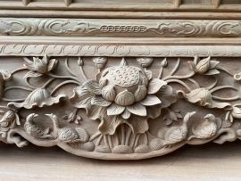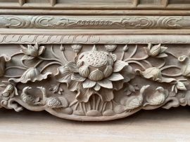 Bộ sập thờ sen cò 1m97 gỗ gõ đỏ (anh Thành, Quảng Ninh)Sập thờ sen cò được lột tả bằng bức tranh vịt trong hồ sen cực kỳ sống động. Một khung cảnh thiên nhiên tươi xanh, trong lành mở ra nhìn rất cuốn hút và có chiều sâu.Cận cảnh họa tiết bông sen ở trung tâm dạ tiền sập thờ siêu vip
