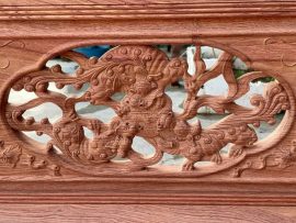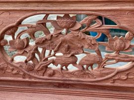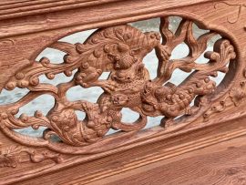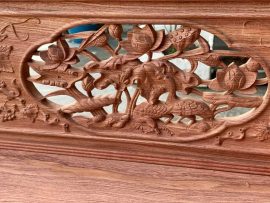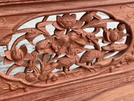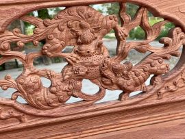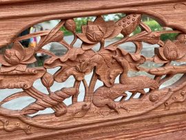 6 lô đục tích tích sen vịt – “bảo áp xuyên liên” trên nền tấm gỗ gụ liền khối dày 56cm. Họa tiết đục nọng thủng hoàn toàn là thủ công bằng tay nên có độ sắc nét kênh bong khá cao, độ chân thực được đặc tả vô cùng. Từng hoa văn chạm khảm đều được chăm chút kỹ lưỡng, nuột nà, phẳng phiu không tì vết