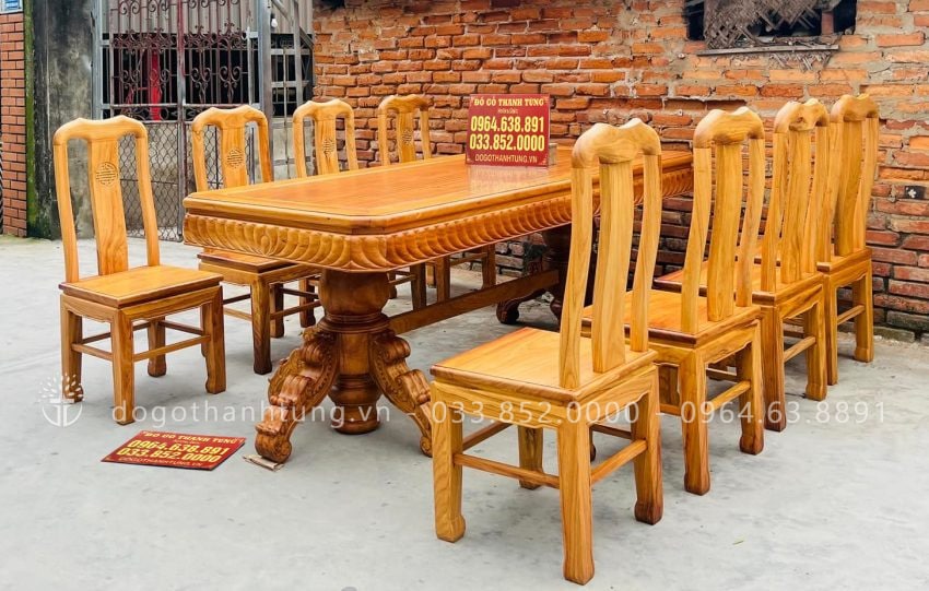 Mẫu bàn vát góc được kết hợp cùng 8 ghế ăn lưng cao đục chữ thọ tròn. Hàng tay cột liền xuống đến chân sau với đường kính 5cm. Thiết kế chân vuông 7cm khỏe khoắn, chắc chắn. Phần mặt ngồi thiết kế ván tràn 3cm dày dặn được đánh giáp bóng mịn nổi vân gỗ siêu đẹp.