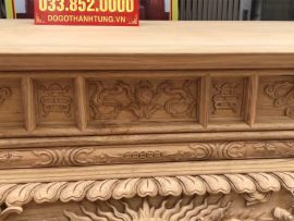 Bộ sập thờ có chân 24cm được đầu tư đục đẽo tỉ mỉ công phu. Nét đục sâu nổi 3D cực kỳ tinh xảo, thể hiện cái tài và sự tỉ mỉ của người nghệ nhânSản phẩm sau khi hoàn thiện mộc kỹ, xử lý bề mặt nhẵn mịn, sẽ được tiến hành sơn phủ PU cao cấp nhiều lớp để bảo vệ cốt gỗ, gia tăng vẻ đẹp, cho ra diện mạo hoàn hảo nhất tô điểm sự sang trọng, đẳng cấp của không gian.Bộ sập thờ đi kèm với 1 bàn cơm rộng vừa 2 mâm cơm được chế tác cùng chất liệu với chiếc sập thờ. Mặt bàn cơm liền tấm đóng khuôn tranh dày dặn, quây tứ diện đục họa tiết Tứ Linh đồng bộ với sập thờ.
