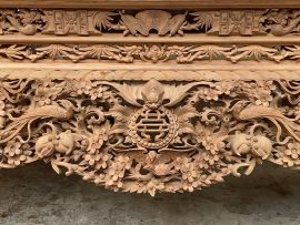 Sập thờ mai điểu: ngang 2m17 x sâu 1m07 x cao 1m27, dạ tiền dày 8cm, chân 24cm, khuôn 5 ván 2cm.