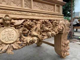 Mặt bên sập thờ mai điểuChân sập thờ mai điểu dáng trường tinh xảo, nhìn rất bề thế và cuốn hút. Được ghép mộng với bộ quây vô cùng chắc chắnQuây trước sập thờ mai điểu, cổ liền đục ngũ tiền, hoa văn cân đốiMai cổ thụ, chim điểu chuyền cành được hiện lên sắc nét có hồn qua bàn tay tài hoa của nghệ nhân đục lâu nămMai điểu thể hiện sự sinh sôi, nảy nở như tiền tài hội tụ. Do đó khi sử dụng vào sập thờ tượng trưng cho sự đảm bảo cho thịnh vượng, phát tài phát lộc, rộng mở tiền tài cho gia chủSập thờ mai điểu như một tác phẩm nghệ thuật đẹp miễn chê ngay cả khi còn nguyên mộc