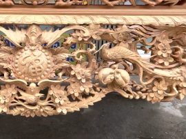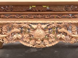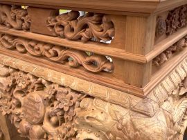 Sập thờ mai điểu: ngang 2m17 x sâu 1m07 x cao 1m27, dạ tiền dày 8cm, chân 24cm, khuôn 5 ván 2cm.