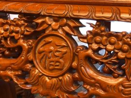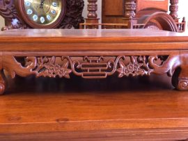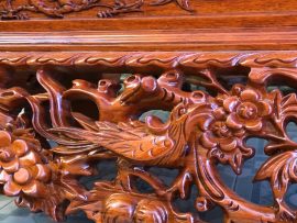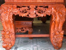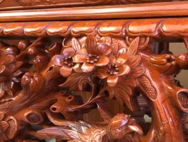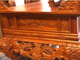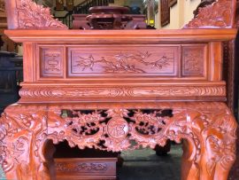 - Sập thờ mai điểu gỗ gõ đỏ cao cấp đi kèm là 1 bàn cơm cùng chất liệu. Nổi bật với hoạ tiết cây mai cổ thụ xum xuê và đàn chim điểu đang líu lo chuyền cành được chạm khắc tỉ mỉ và tinh xảo trên bức dạ tiền.