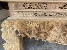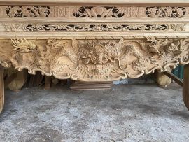Đồ gỗ Thanh Tùng vừa hoàn thành dựng mộc một bộ sập thờ tứ linh gỗ gụ Lào đục tay tinh xảo. Sập cỡ đại dài 2m17, chân 24cm ghép mộng tự nhiên vô cùng chắc chắn. Khách đến xưởng kiểm tra mộc, nhận mộc, ký tên đóng dấu xong, xưởng mới tiến hành sơn phủ PU lên màu sản phẩm.