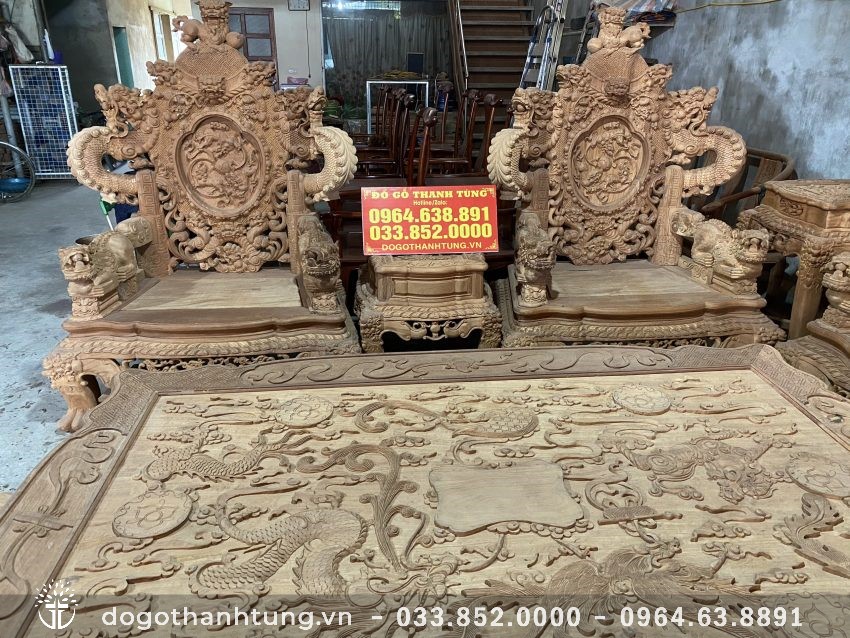 Bộ bàn ghế phòng khách Nghê đỉnh Rồng khuỳnh hàng cao cấp đục tay 100% và làm tại xưởng giá tận gốc không qua trung gian, nên quý khách hang có thể yên tâm về giá cũng như chất lượng sản phẩm. Hàng đặt riêng theo yêu cầu. Chi tiết vui lòng liên hệ Đồ Gỗ Thanh Tùng theo hotline: 0964.63.8891 – 033.852.0000 để được tư vấn hỗ trợ đặt hàng.